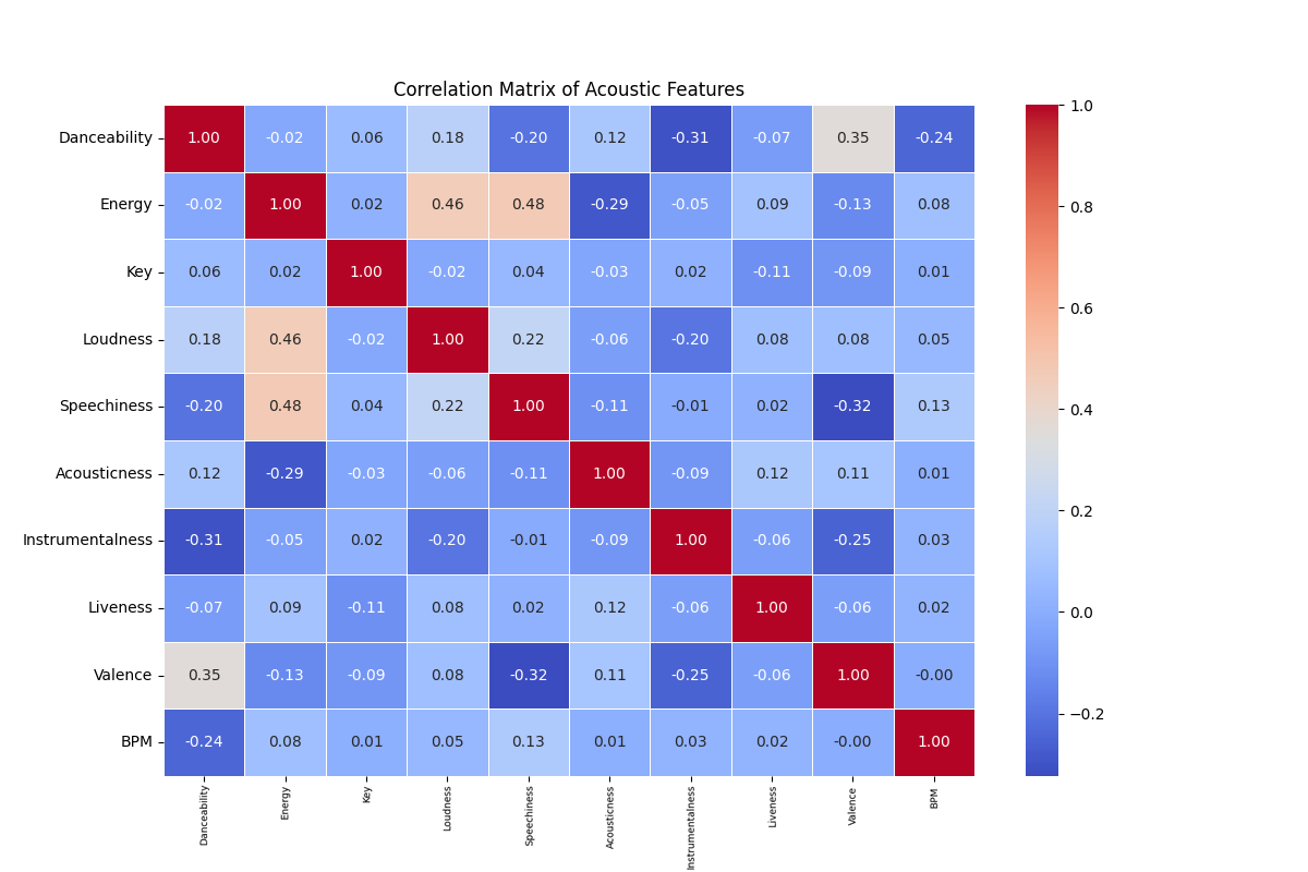 Using Spotify’s Web API, we extracted detailed acoustic features for each track, including energy, loudness, danceability, acousticness, speechiness, and tempo. Our methodology employed advanced statistical techniques including Analysis of Variance (ANOVA), Principal Component Analysis (PCA), and correlation analysis to identify patterns in the data.