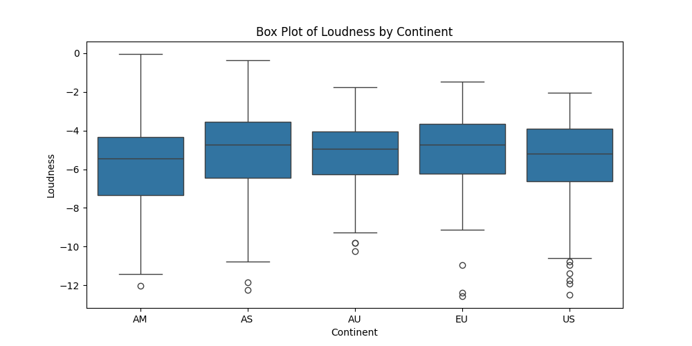 Loudness emerged as the most significant differentiator across continents. Our analysis showed statistically significant differences (F(4, 452) = 2.61, p = 0.0349), with American metal tracks averaging notably higher loudness levels compared to Asian metal. This finding aligns with historical production differences and cultural attitudes toward sonic intensity.